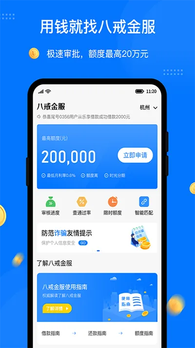 八戒金服是重庆猪八戒金融服务有限公司为年轻群体打造的智能借贷平台。采用先进风控技术,遵循监管要求。无需抵押担保,手机实名认证即可。额度最高20万,审批高效,费用透明,还款方式多样,由持牌机构支持,安全可靠。