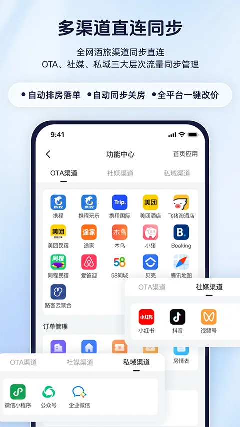 1. 多渠道直连同步:全网酒旅渠道同步直连,实现三大层次流量同步管理,涵盖携程、美团等OTA渠道,抖音、视频号等社媒渠道,品牌小程序、酒旅会员系统等私域渠道,还能实现自动排房落单等智慧经营功能。