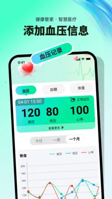 2、精准数据管理:录入的血压、血糖、体重数据会被有序整理,以清晰图表呈现。可随时查看历史数据,通过曲线走势了解指标波动,掌握健康变化趋势。