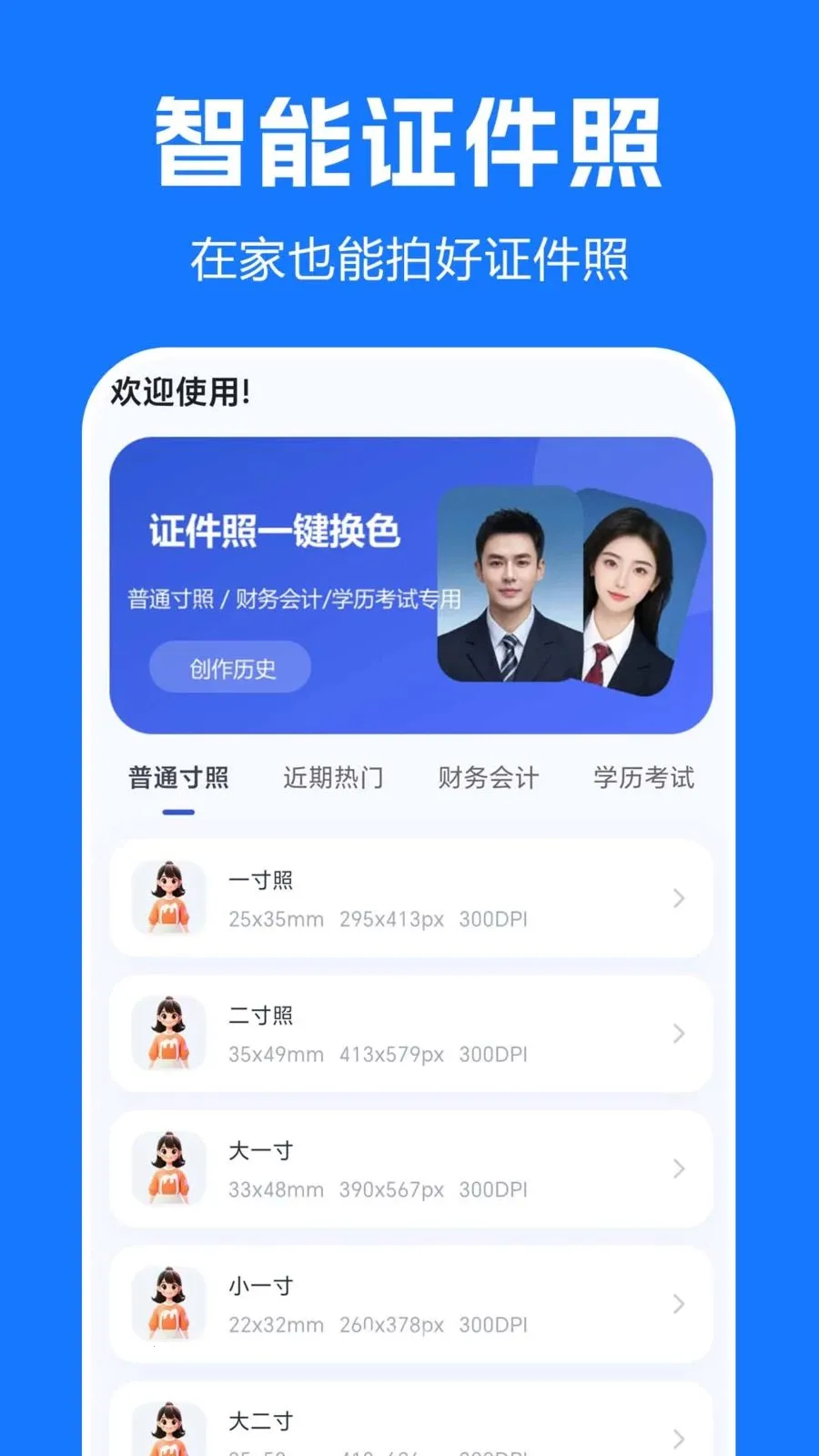 3、提供一寸、二寸、大一寸、小一寸等多种标准尺寸,帮助快速生成符合规范的电子证件照。