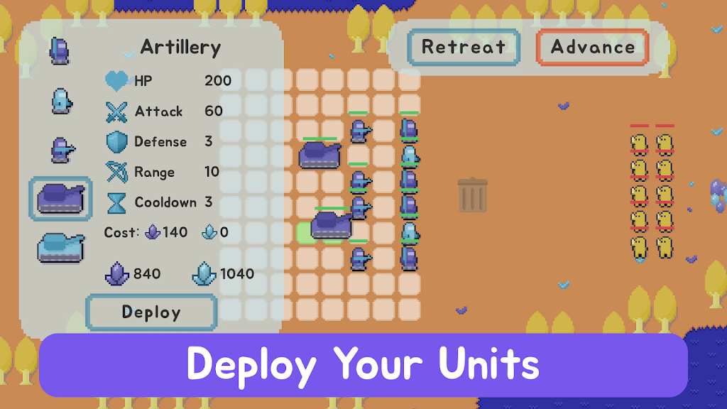 3、单位组合与升级,包含多种不同类型兵种,可收集资源强化升级。