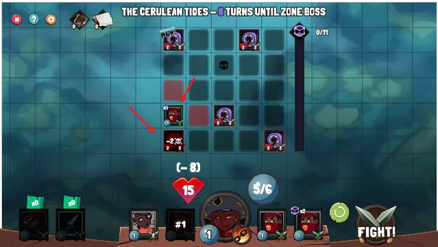 1、游戏中拖动下方的角色卡牌即可放置到格子中,格子周围的红色区域则是他的攻击范围。