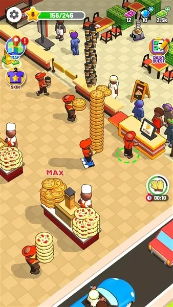 3、社交互动增添趣味:支持绑定社交账号,分享成就,邀请好友同台竞技、联动经营,交流技巧共建披萨王国。