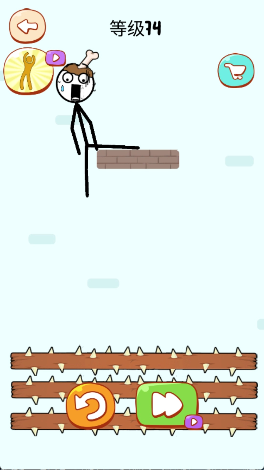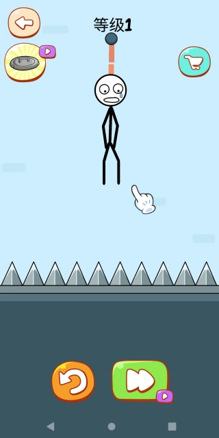 2.只需把火柴人往下方拖拽,使其掉落到尖刺上就行。像图里展示的那样,顺利通过关卡就能得到金币奖励。