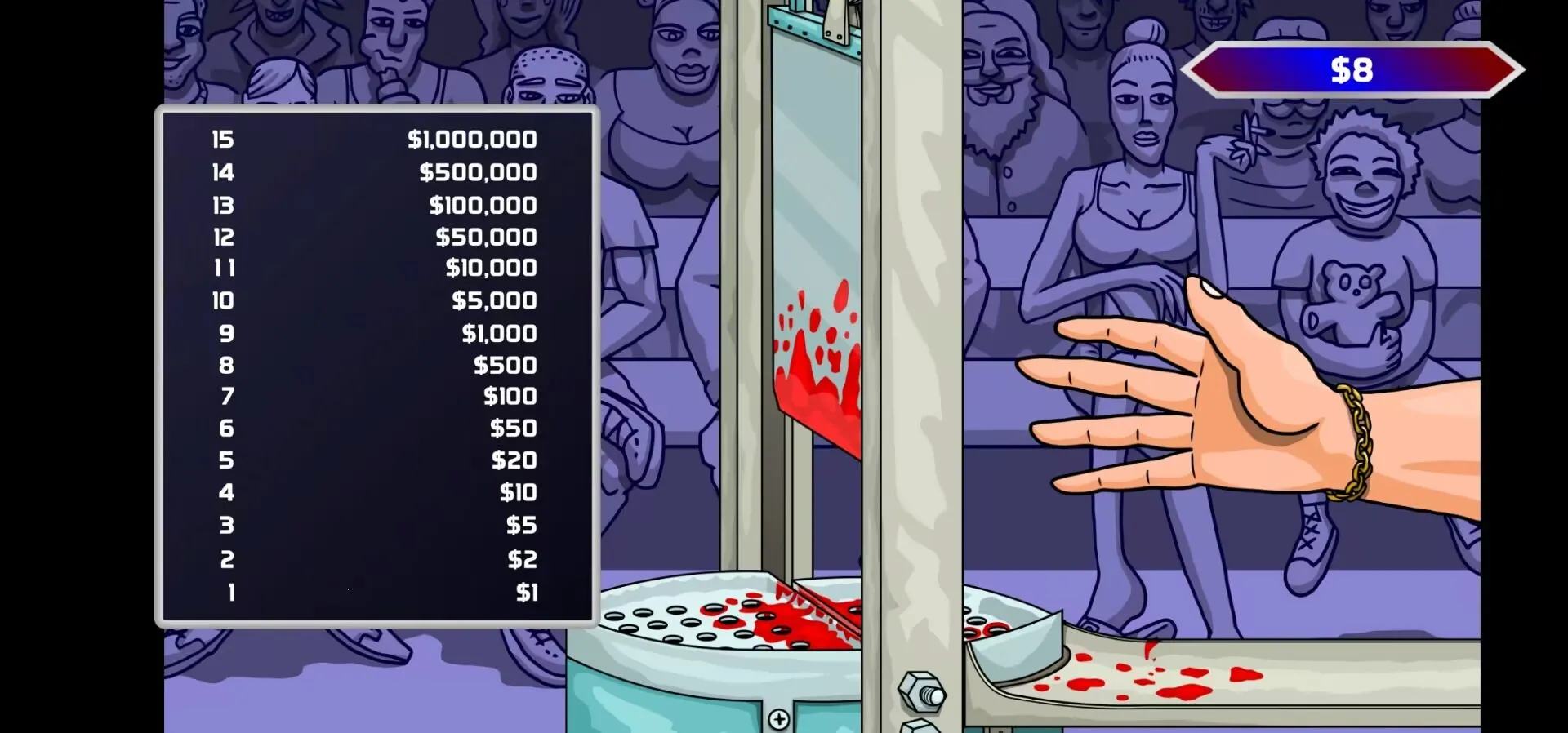 在《断手百万富翁(抢钱游戏)》中,玩家参加游戏节目争取成千万富翁,要在锋利断头台间快速拿钱并及时收手,可尝试2次,还能玩额外回合积累现金,随着进程断头台刀片速度加快,考验玩家胆量与速度。