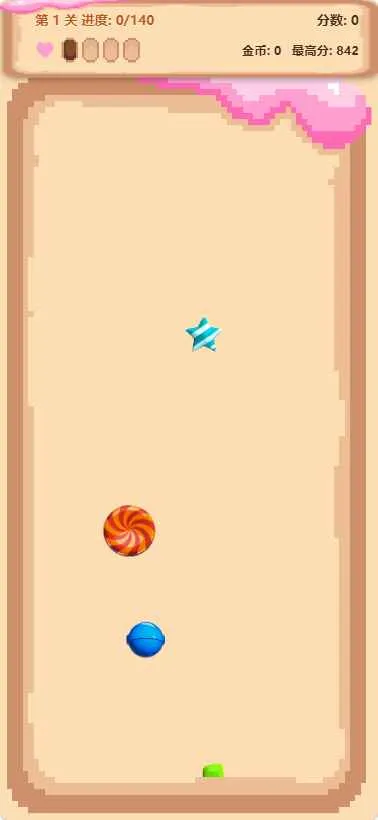 糖果碎碎乐是一款切割游戏,玩家在游戏区域划动手指切割飞出的糖果得分,切到炸弹扣生命,可用护盾抵消。达成每关目标分数通关获金币,能在商店买道具。支持多种糖果,有最高分与通关数记录,适合碎片时间反复玩。