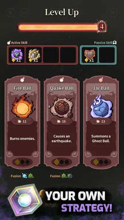 2. 丰富的策略系统与Roguelite元素融合,将弹珠射击玩法与Roguelite系统深度结合,每波怪物防守结束后可挑选升级随机的技能和增益选项。