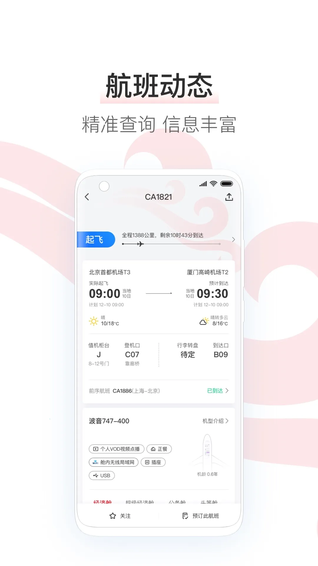 中国国航APP超棒的!它能解决咱们出行订机票的各种需求。航线网络超强大,覆盖中国及全球主要城市,有298条航线,通航154个城市,31个国家和地区都能到。每周展示超7000个航班、130多万个座位。功能超丰富,特价机票能查询预定,支持语音识别购票,支付安全快捷。能提前选座,免去机场柜台排队烦恼。航班动态随时掌控,精准查询起降时间,支持语音输入,航班状态变更第一时间知晓。还有凤凰知音账户管理,里程明细、账单、受让人管理及拍照补登都能搞定。里程能兑换免票或礼品。出行管家提供特价机票、乘机手续、航班动态、自助改期等简便操作。不管旅游、出差还是回家,用它都特省心,轻松开启便捷的国航之旅,强烈推荐下载!