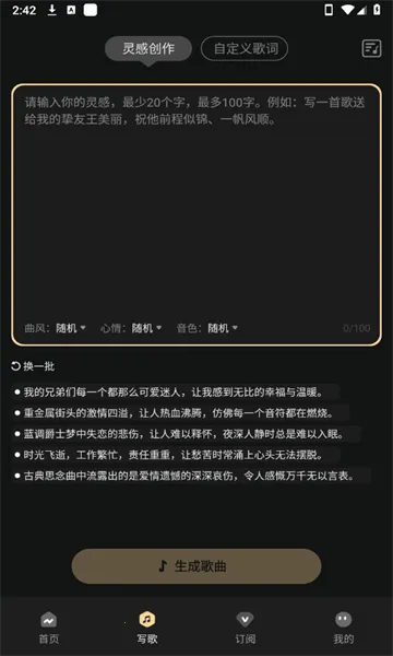 3、输入灵感曲子自动生成,创意之旅更简单。