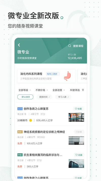 1. **权威性高**:汇集2000余位来自全国各地的医生护士药师等领域专家,通过线上视频音频以及PBL互动教学等方式制作权威教育课程,构建基层医务人员与专家零距离沟通的线上平台。