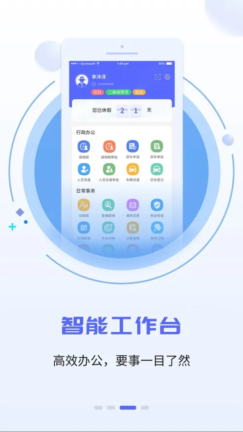 1、智慧小蓝为消防站打造管理软件,可实现管人、抓事、定物、谋战等功能服务,助力更好管理。