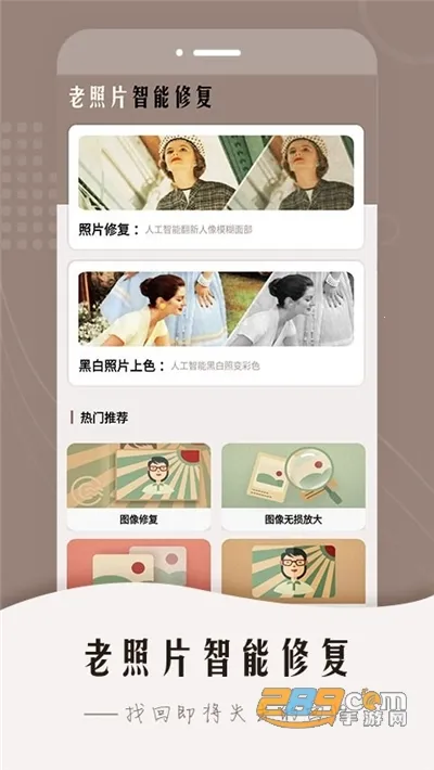 智能修复老照片app利用先进AI技术,专注老照片修复。能智能上色、无损放大、修复模糊破损,还可擦除元素、添加特效。操作简便,采用最新算法,功能持续更新,助您轻松还原珍贵回忆,让老照片焕发光彩。