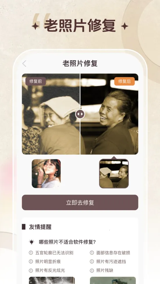 智能修复老照片软件采用最新人工智能算法,能智能识别照片内容并针对性修复,确保效果自然真实。