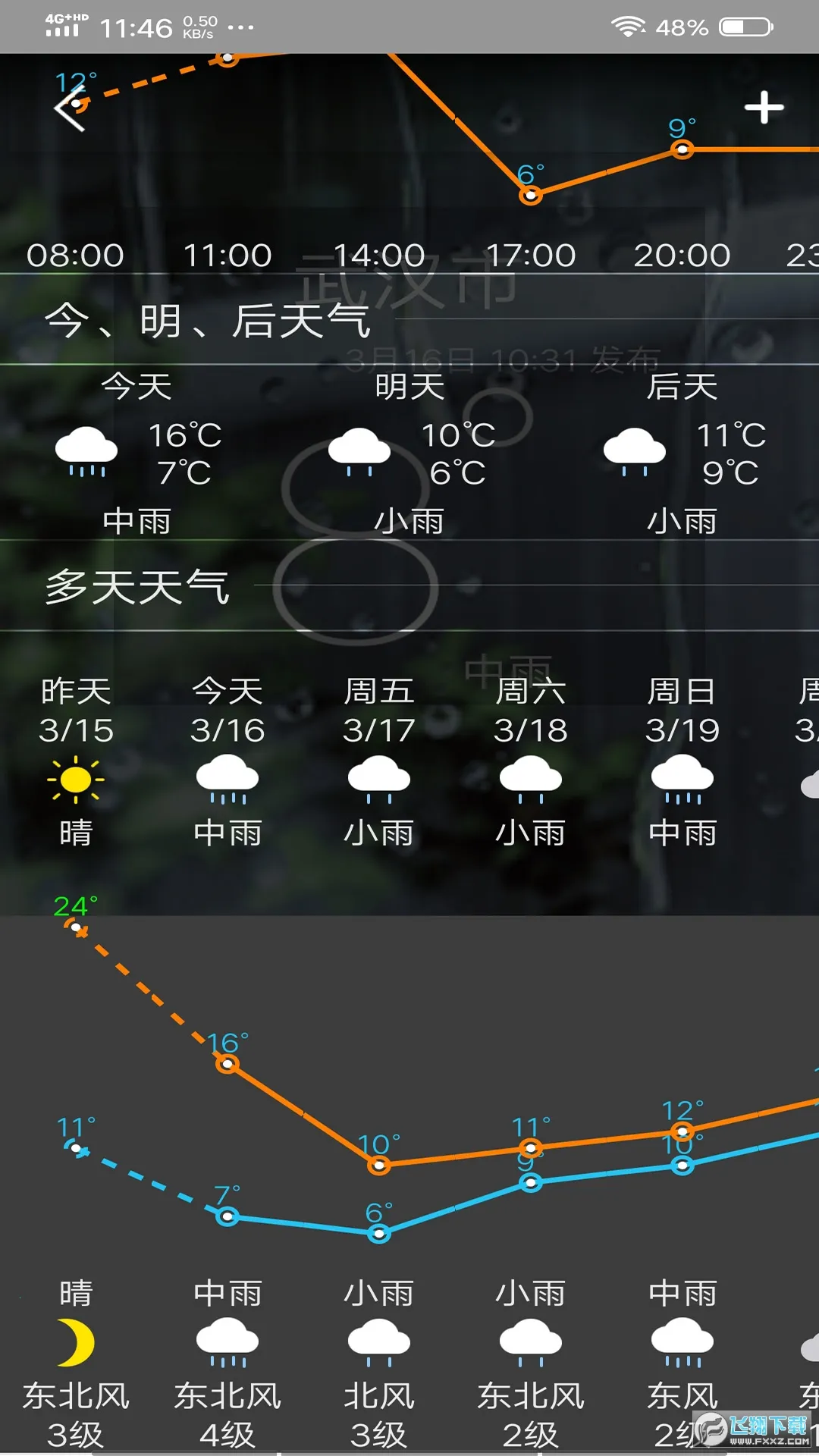 3. 能一键分享天气到微信朋友圈,还可轻松查阅逐小时天气预报、7日天气预报及空气质量预报等。