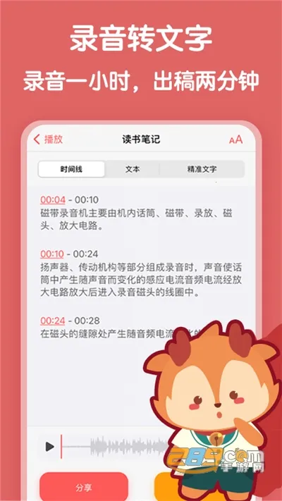 随声鹿2025最新版本是一款强大的手机录音软件。操作简单,功能丰富,支持多种场景录音。具备声控录音、智能降噪、音频编辑、语音转文字等功能,还有多种变声和音效,方便用户记录生活、工作与学习中的每个时刻。