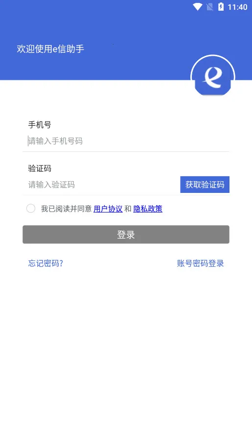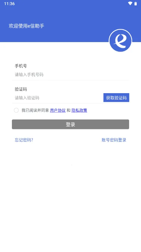 首次启动e信助手安卓版,阅读并勾选同意用户协议后进入登录界面。登录方式多样,若当前不便,可点击更换选择其他验证途径。选账号密码登录,填好用户名与密码点击确认就行。要是忘记密码,通过找回密码功能按步骤填写验证信息就能重置。有了它,办公超方便,赶紧来试试吧!