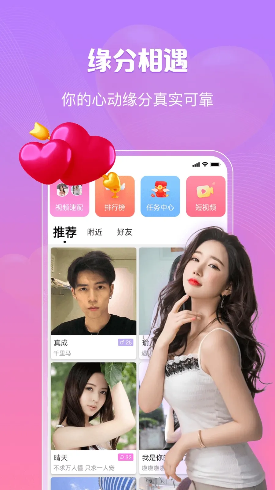 1、帮助单身人士找到喜欢对象,提供多样交友方式,探索附近的人。