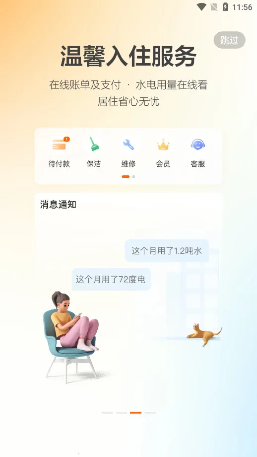 4、多样功能体验:具备APP找房、移动缴费、呼叫服务、约看预定等实用功能,方便快捷。