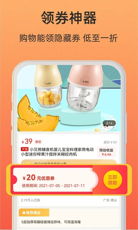 2、与淘宝天猫京东拼多多蘑菇街等一线商家合作,购物领海量优惠券还能拿返利。