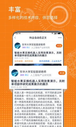 对企业来说,在这里能轻松找到感兴趣的科研项目,和各研究领域的学者、研究人员交流,打造线上学术圈,通过即时聊天等开展学术交流,推动企业项目业务升级,让科研技术多样发展。而且操作简单便捷,随时随地都能达成合作。这里有丰富多样、价值高的技术内容供选择。有了科企岛,企业在技术交流、科研合作等方面都方便了许多,能更高效地发展,快来下载体验吧!