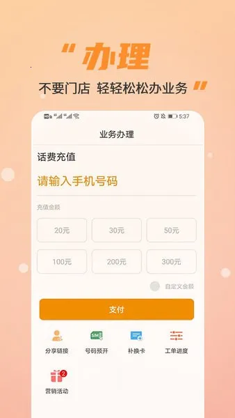 4、进入业务办理页输入手机号并选择充值金额,点击支付即可完成充值。