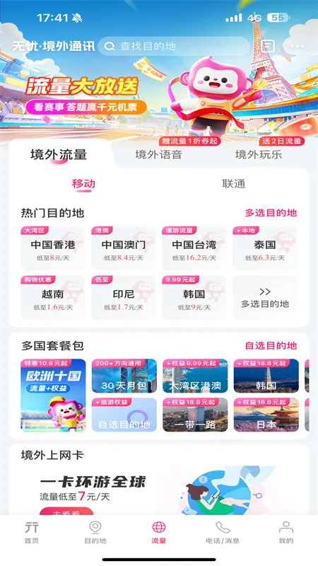 无忧行 2025 最新版本是中国移动推出的境外旅游服务平台。提供全线八折境外上网流量包,低至 4 元/天,39 个热门方向境外电话限时免费拨打。还有翻译、汇率查询、旅游攻略及优惠门票等服务,满足多样需求 。