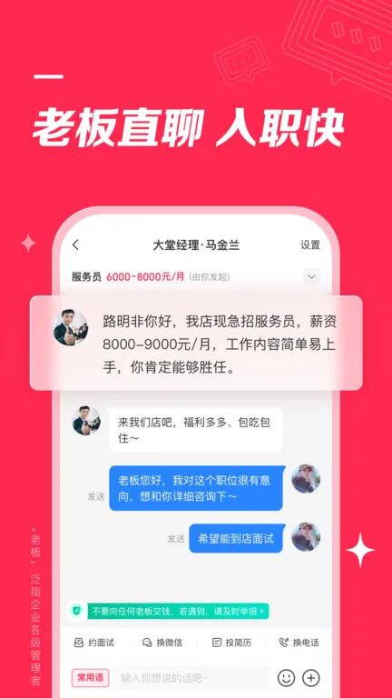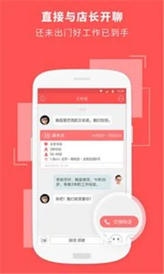 2、求职高效,能与主管在线聊天,聊爽即可上班,一小时就能快速入职。