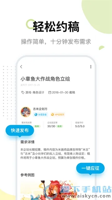 2、具备方便的发布模板,3分钟可发布完整需求;有简单易懂的邀请功能,每日能发10个邀请,还有定向需求;提供画师和作品列表展示页面辅助找画师;工作流程严格规范,分阶段审核稿件并支付保证金。