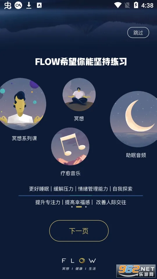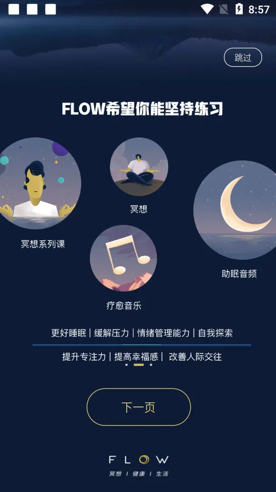 FLOW冥想是融合正向心理学与声学科技的身心成长平台,构建冥想难度分级系统。课程配备可视化引导与音频,助新手掌握技巧。有丰富声音内容与功能,能减压助眠、管理情绪,全新版本带来沉浸式冥想体验 。