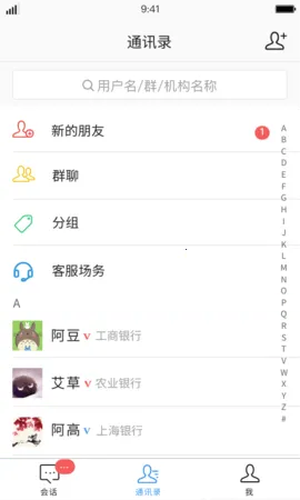3. 功能涵盖即时通讯、管理好友分组、查看软件列表、登录通讯录等,默认展示会话列表方便即时通讯。