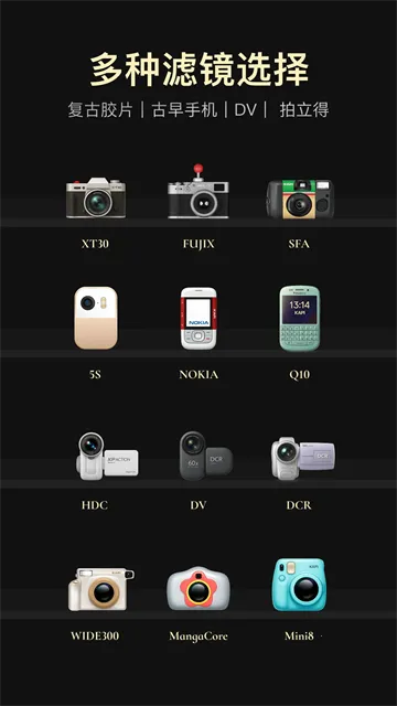 1. 高度还原经典影像风格,将宝丽来、柯达、富士、诺基亚等老机风格装进口袋,真实模拟老式设备成像质感。