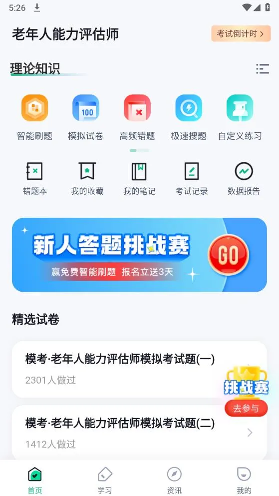 1、丰富题库:涵盖老年人能力评估师考试的历年真题集、模拟试题题型,容纳大纲知识点、重点、难点、易错点,方便用户全面练习。