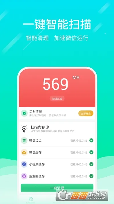 3、功能多样,有一键智能扫描,可智能清理并扫描出所有缓存垃圾,一键操作加速微信运行;深度清理聊天群和朋友圈产生的图片视频,释放手机存储;还有自动清理功能,开启后每天自动清理微信缓存垃圾。