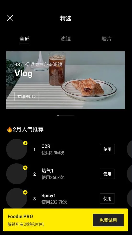 Foodie是专为美食摄影爱好者打造的相机软件。有超30种美食滤镜,如美味、野餐等风格,可任意调节滤镜细节。还有风景滤镜、虚化功能、无声模式,支持分享照片,能帮用户轻松拍出美食大片,定格专属食光。