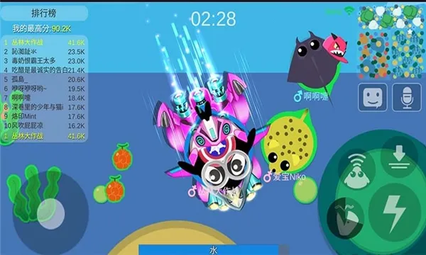 2、吞噬进化:通过吃不同食物和其他玩家获取经验,升级进化成更高级动物。
