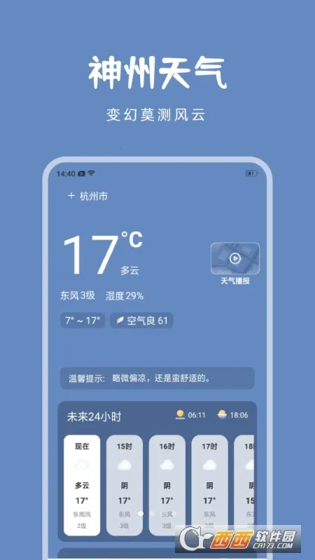 全国城市一键切换,界面简洁操作简便,数据每日多次刷新,特殊天气提前预警,更有农历节气等融合服务。