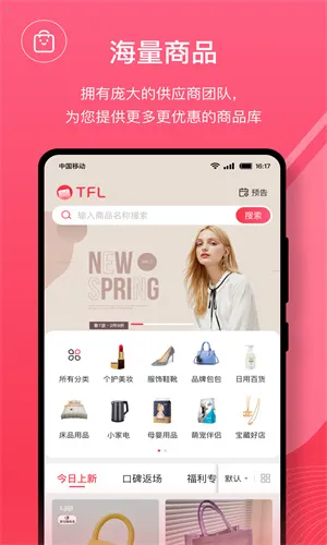 TFL是一款超实用的手机生活购物软件。它能满足你多样的购物需求,商品种类超齐全,涵盖箱包、美妆、服饰等多种类型。这里优惠活动超多,有折扣和包邮专区,下单还能用购物券,还有大额返利,能帮你减少消费金额。其优势众多,有权威售后客服,售后问题专业团队解决,保障你的利益。多种商品搜索与浏览系统,可通过关键词、分类或推荐等快速找心仪商品。还会基于你的购物历史和浏览行为,进行个性化商品推荐。平台自主帮供应商拍摄产品图片、编辑销售文案,弥补资料不全问题,且负责销售商品,供应商无需囤货,出库发货流程更合理。如果你爱购物,TFL能让你轻松下单选购好物,享受优惠,节省开支,筛选出心仪商品。