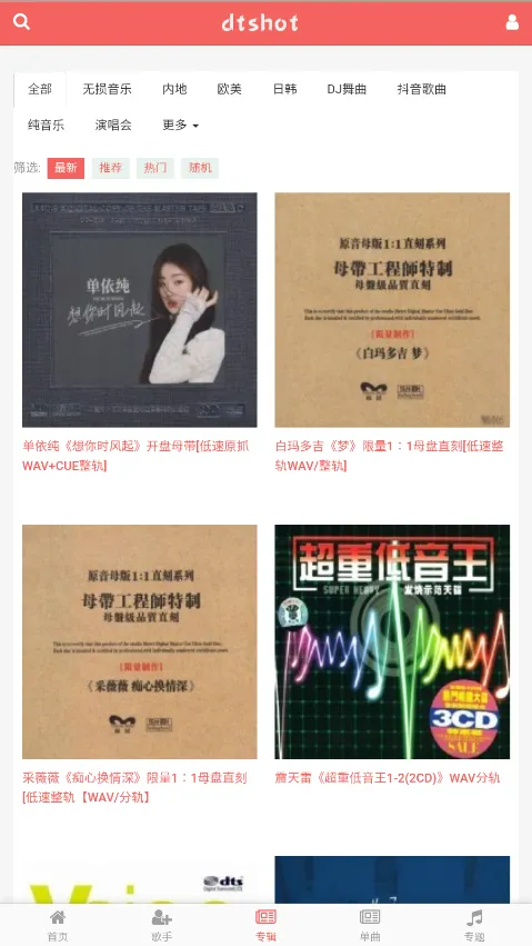 DTshot无损音乐吧是个超棒的资源整合平台,能满足你对高品质音乐的需求。它有海量无损音乐资源库,超10万首无损音轨,涵盖华语、欧美、日韩等多种语种,从经典到流行一网打尽。这里每张专辑都有多种音质可选,像FLAC、24bit、96kHz、DSD等,新碟上线速度超快。智能搜索引擎超厉害,支持歌手、专辑、ISRC编码多维度检索,输入关键词就能秒级找到目标音乐。而且每个资源都配有完整音乐信息,包括扫描版封面、内页歌词本与CUE分轨文件,部分稀缺资源还有额外珍贵内容。下载体验也很棒,提供百度网盘、115网盘直链下载三通道,速度稳定在5MB/s以上,资源采用分卷压缩验证码解压,每日更新维护失效链。有了它,找高品质无损音乐超方便,尽情享受音乐盛宴吧!