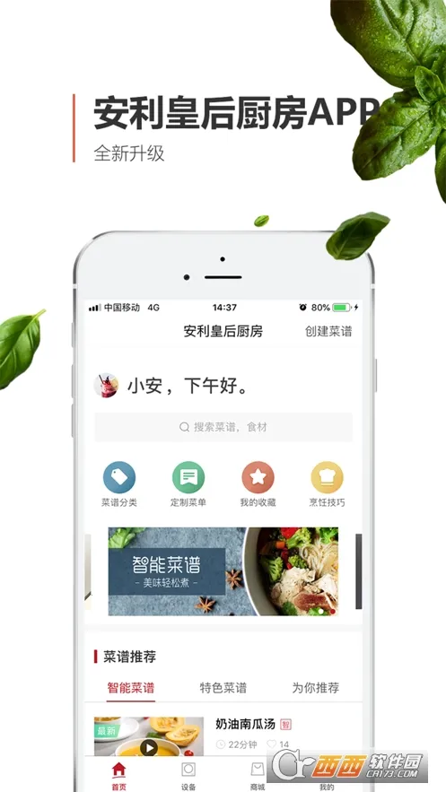 2. **功能多样**:具备物联网功能,能通过蓝牙连接手机与安利皇后智能烹饪电磁炉,实现智能控制和智能烹饪;有安利伙伴专属功能,如创建菜谱、草稿箱保存、自建菜谱分享、玩转美食趴等;还有烹饪技巧、个性推荐、我的收藏、商城等功能。