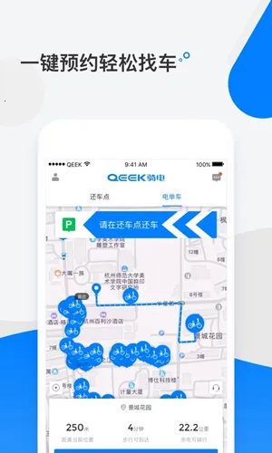 3. 无桩限制,自由停放,只要在城市公共停车区域内还车即可,方便快捷。