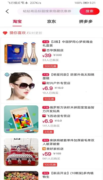 3. 超级优惠券搜索:支持各种优惠券搜索,一次点击即可查询淘宝天猫数千万商品,轻松省钱。