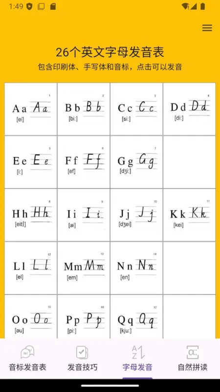 1、48 个音标真人发音:软件收录 48 个音标,有标准真人发音,助学习者打好音标基础。