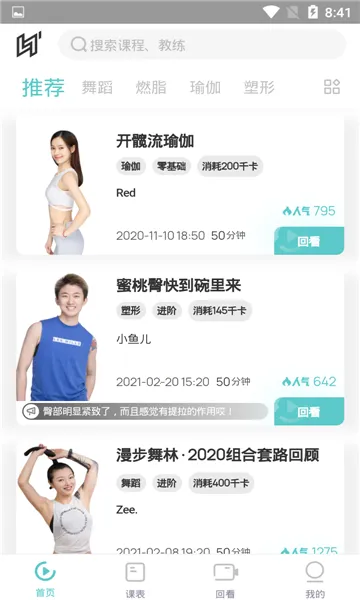 有线上一对一私教、团操小班课模式、训练计划等,还有明星教练在线直播,多人直播弹幕互动。