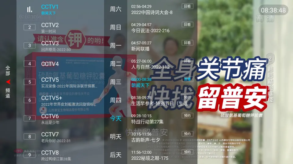 2. 支持节目预约与回看,观众能预约即将播出的节目及回看过去三天内的直播内容,追剧更方便。