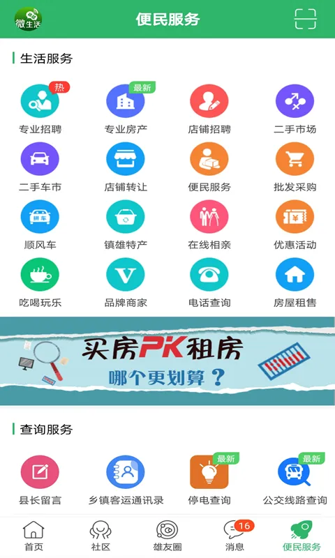 镇雄微生活是为镇雄市民打造的生活服务平台,整合生活服务、人才招聘等信息。有同城交友、微友圈等功能,提供公交、快递查询等便民服务,新闻资讯新鲜及时,让生活更美好便捷,本地用户超50万。