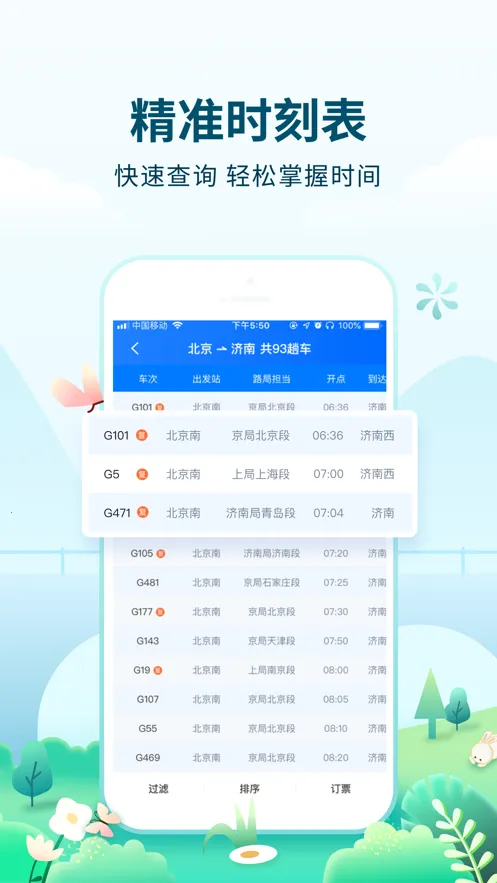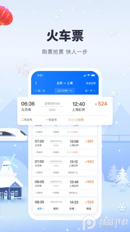 车票预订,能在界面中找到用户所需车票,实现极速抢票,让用户快人一步购票,实现购票自由。