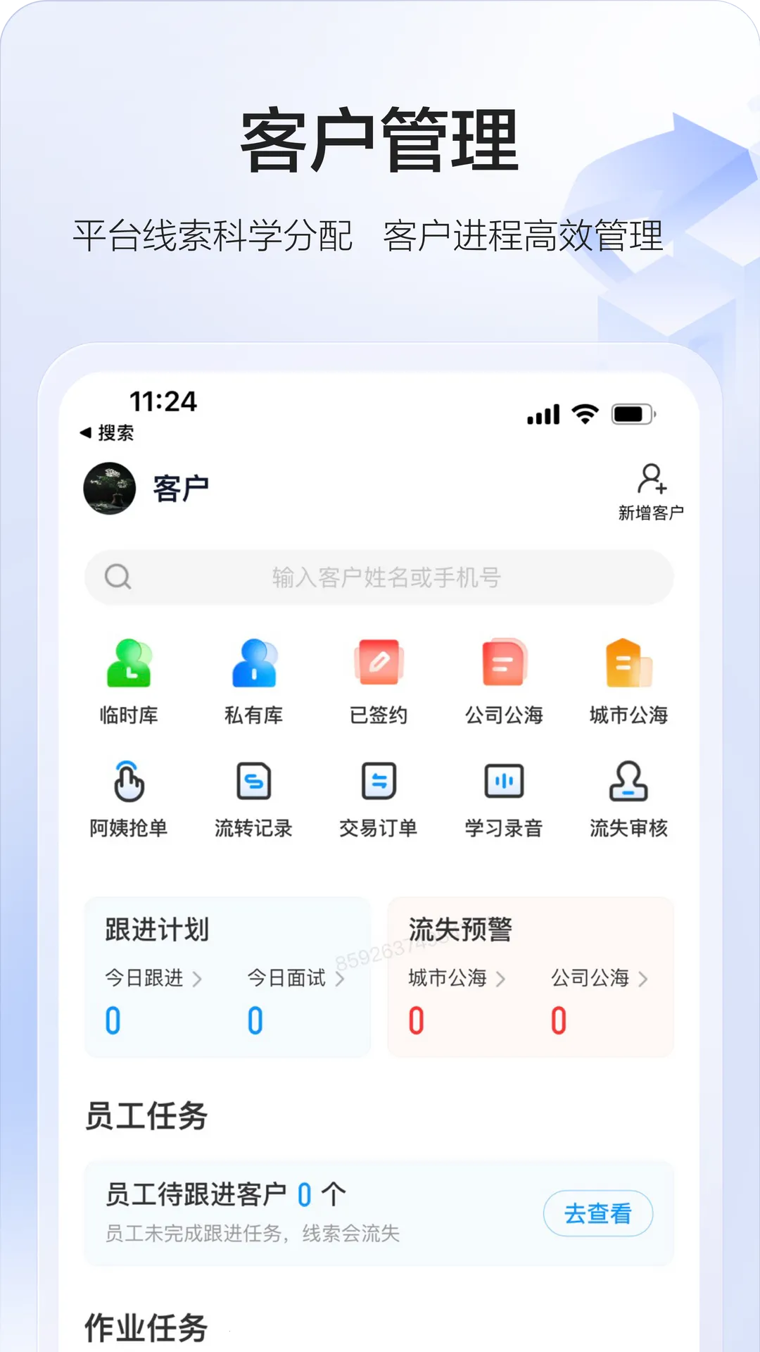 平台功能强大,有客户管理平台,能精准分配客户,保证线索价值最大化。共享阿姨库中,阿姨都经过百分百体检背调,找好阿姨不再难。首页工作台聚合了多种高频作业板块,像线索接单、待办事项管理等,能为每日工作精准提效。微聊消息接收平台可让你及时收到线索、阿姨动态等消息,方便与客户高效建联。培训管理还能辅助商家开展阿姨培训业务,提升阿姨专业度和就业率。