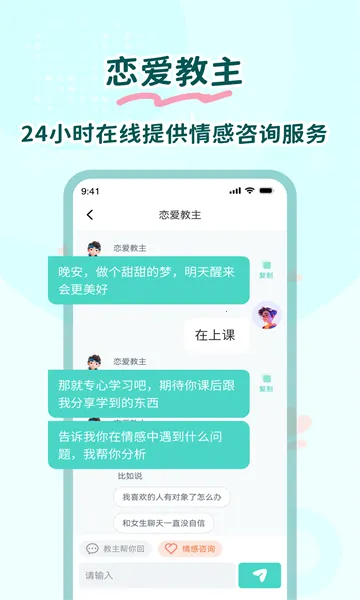 2、设有恋爱教主,24小时在线的专属恋爱导师,可为恋爱求学之路答疑解惑。