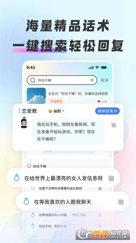 1、拥有10W话术供挑选,根据恋爱场景精选大量实用话术,一键搜索就能轻松找到合适话题,追爱无忧。