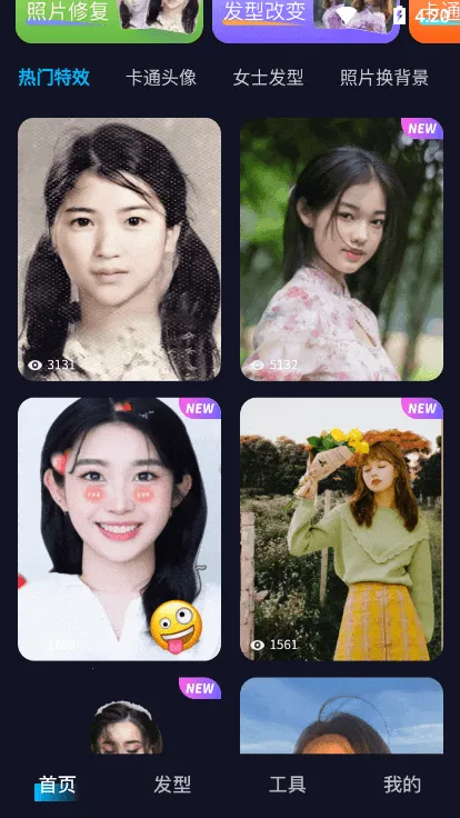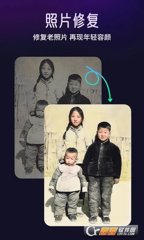 拥有多种特色功能,如AI照片修复、黑白照上色、照片变卡通、一键变老变年轻、性别变化等。